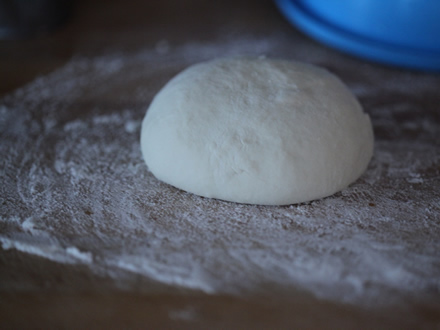 - Se amesteca faina cu praful de copt intr-un vas larg. Se face o gaura in mijloc. Se amesteca iaurtul cu sarea si se toarna in centru. Cu degetele incepeti sa trageti faina peste iaurt, amestecand concentric. Cand nu mai puteti amesteca cu degetele incepeti sa framantati pana cand toata faina este absorbita. Framantati apoi manual macar 10 minute sau in masina de paine pe programul de framantare, ca sa obtineti un aluat elastic.