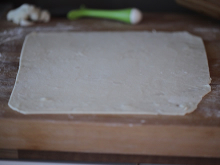- pe masa data cu faina intindeti, din fiecare bucata de aluat, foaie subtire, dar nu atat incat sa se vada prin el. Eu am intins foi de 35 x 40 cm. Decupati marginile astfel incat sa obtineti un dreptunghi.