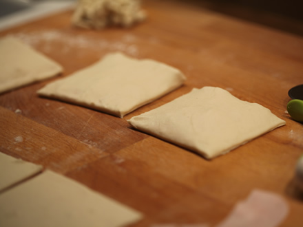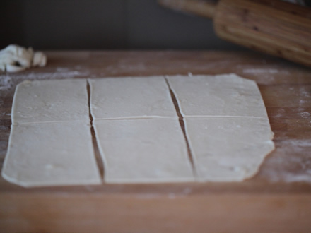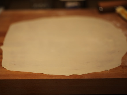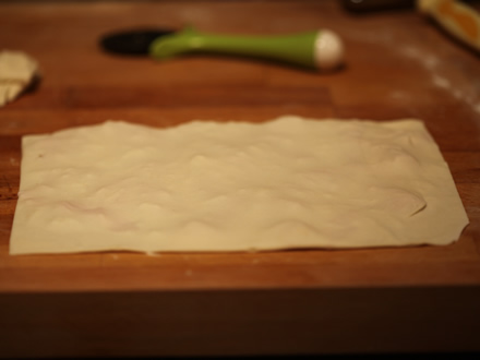 - taiati fiecare foaie in 6 bucati egale (dreptunghiuri). Pe fiecare bucata, pe jumatate din foaie, asezati umplutura dorita. Acoperiti umplutura cu cealalta jumatate de foaie. Presati marginile. Daca doriti margini perfecte, taiati-le fin cu o rola de patiserie. - Varianta 2 (placintele subtiri rulate; pozele 8-16)- pe masa data cu faina intindeti din fiecare bucata de aluat, foaie subtire, astfel incat sa incepeti sa vedeti masa prin el.