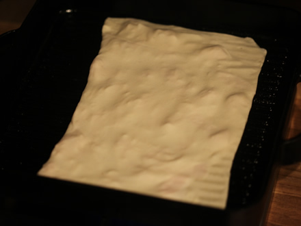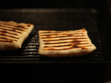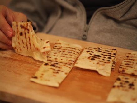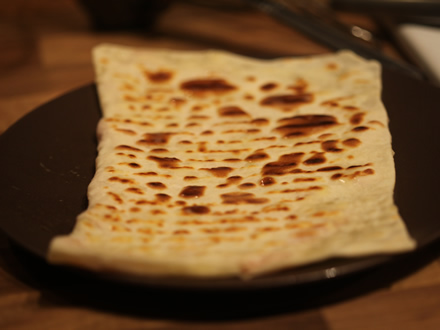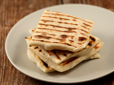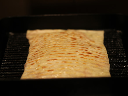 In ambele variante aveti grija sa dati cu faina masa de lucru si sucitorul daca simtiti ca incepe sa se lipeasca aluatul. - Incingeti bine tigaia grill la foc maxim (se poate folosi si o tigaie de fonta sau teflonata) si ungeti-o cu f. putin ulei (ca tigaia pentru clatite; daca ati scapat prea mult ulei, absorbiti-l cu servetele de bucatarie). Dati focul la mediu sub tigaie.