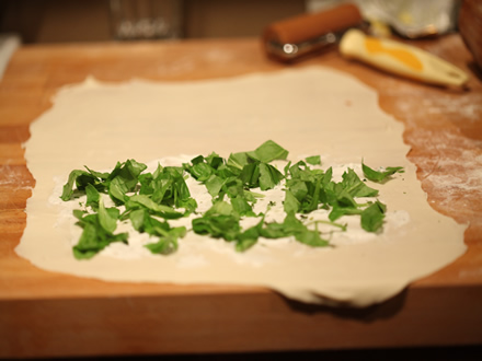 Acoperiti bucatile de aluat cu un bol si lasati-le sa stea 30-60 minute. - In acest timp razuiti cascavalul. Taiati fasii mezelul si spanacul. Tocati mararul impreuna cu menta.