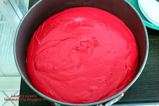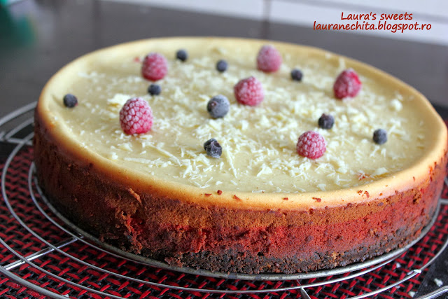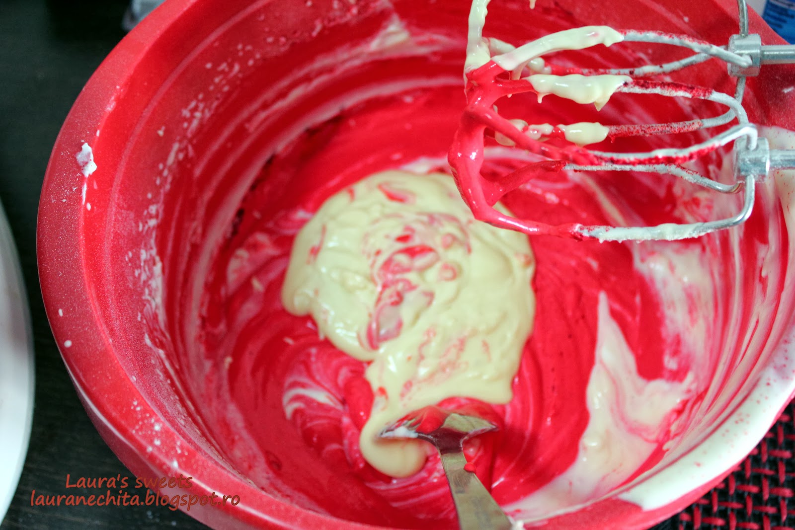 Topim pe baie de aburi ciocolata alba si o turnam peste compozitia rosie. Amestecam si turnam compozitia peste baza de biscuiti. Cealalta compozitie alba o turnam usor peste cea rosie. Atentie, nu turnati in mijloc intrucat se va forma o adancitura in compozitia rosie si nu vor mai iesi uniform straturile. Incepeti dintr-o margine si turnati rotind forma in continuu.