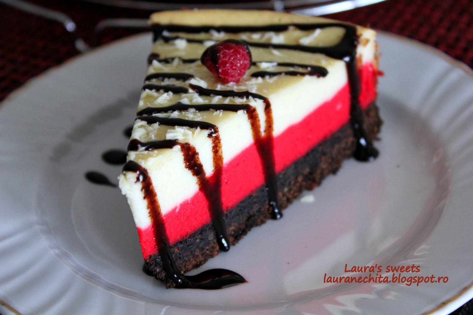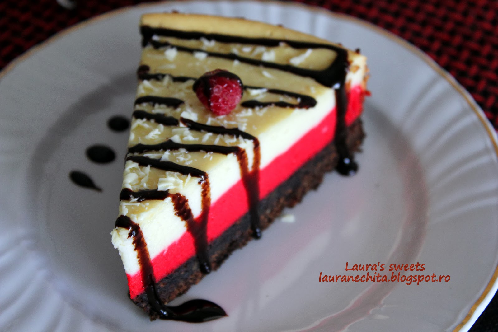 Mai pe romaneste este o tarta cu branza, multicolora. Are o baza crocanta de biscuiti, neagra si doua straturi de branza rosu si alb.