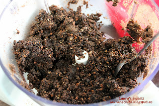 Biscuitii ii bagam la robot si ii rasnim nu foarte marunt. Topim untul, il adaugam peste biscuiti si amestecam bine.