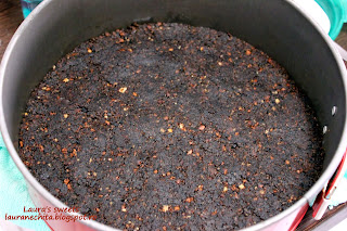 Pregatim o forma de copt rotunda si asezam baza din biscuiti. Atentie, baza trebuie distribuita drept, fara sa formati margini inalte.